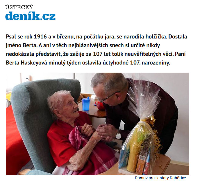 A ani v těch nejbláznivějších snech si určitě nikdy nedokázala představit, že zažije za 107 let tolik neuvěřitelných věcí. Paní Berta Haskeyová minulý týden oslavila úctyhodné 107. narozeniny.